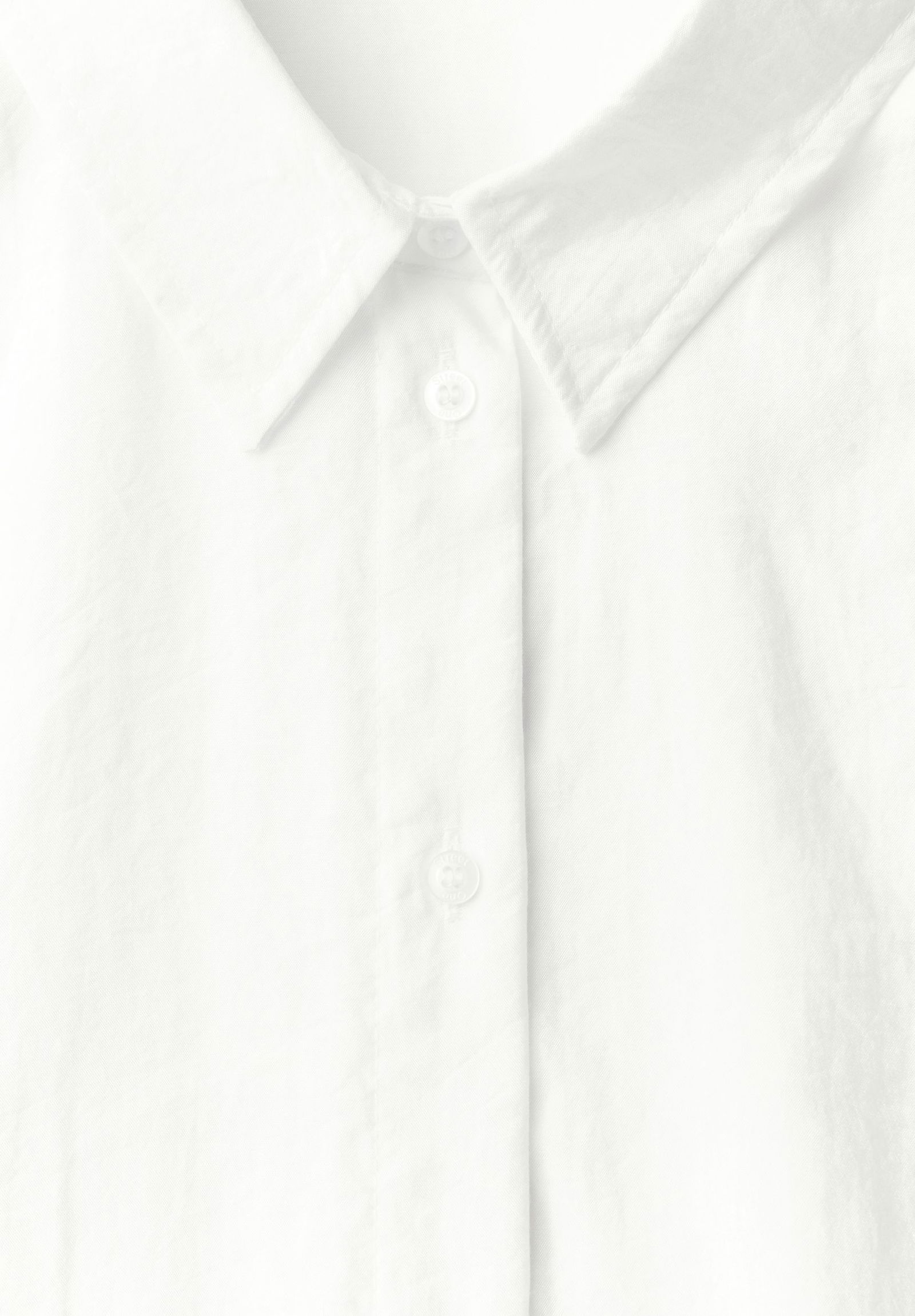 lockere Passform, gerader Schnitt, überschnittener Kurzarm, Hemdblusenkragen, Rückenlänge ca. 61 cm bei Größe 36, Model Größe 177 cm trägt Größe 36, Webware, glatter Griff, leichte Transparenz im hellen Farbton, elastischer Stoff, aufgesetzte Brusttasche, Kellerfalten im Rücken, kurze Knopfleiste, kleine Schlitze in den Seiten