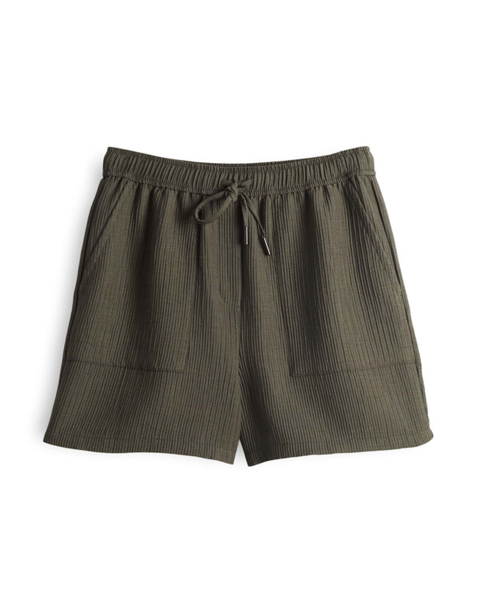 weit am Oberschenkel, Mid Rise, lockere Passform, Kurz geschnitten, Hosenbein Innenlänge ca. 9,5 cm in jeder Größe, Model Größe 175 cm trägt Größe 36, Webware, Crinkle Optik, natürlicher Griff, fließender Fall, aufgesetzte Eingrifftaschen vorn, elastischer Gummibund, Kordel zum Binden