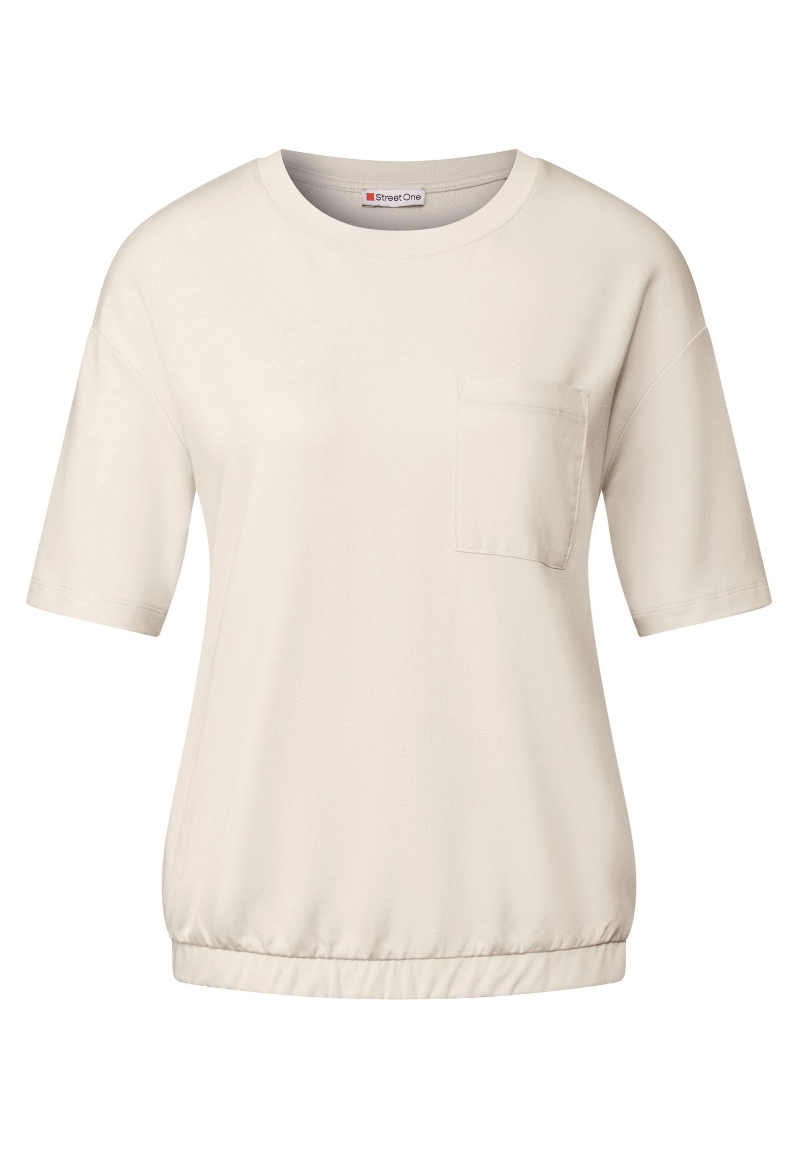 Ein unkomplizierter Favorit für den Alltag: Das T-Shirt von Street One für Damen punktet mit einer lässigen Brusttasche und sportivem Rundhalsausschnitt. Der elastische Saum sorgt für eine schöne Passform, während der Viskosemix mit Stretchanteil angenehmen Komfort bietet. Shirt Rundhalsausschnitt Kurzarm Elastischer Saum Viskosemix mit Stretchanteil Material: Obermaterial: 76% Viskose, 20% Modal, 4% Elasthan; Brusttasche: 100% Polyester
