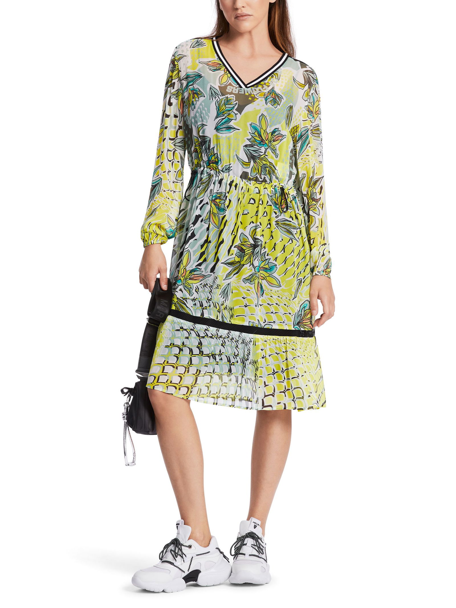 Kleid mit Alloverprint|A-Linie und tief angesetzter Rock. Das Kleid ist aus einer soften Baumwolle-/Viskose-Mischung und allover bedruckt. Halsausschnitt sowie Ärmel- und Rocksaum sind mit kontrastierenden Dessins akzentuiert. Die Schulternaht kann via Kordeldurchzug gerafft werden.|A-Linie|Angedeuteter Ärmel|Rundhals mit Schlitz|Mustermix|Das Model ist 179 cm groß und trägt N3/38.